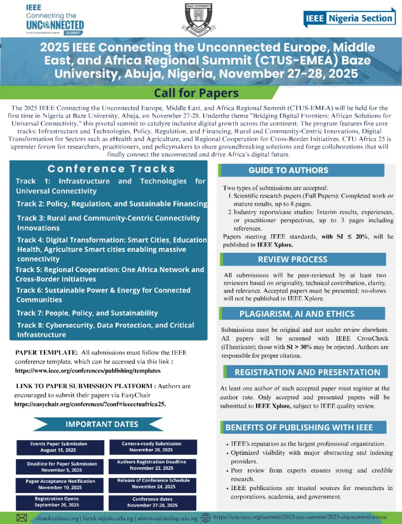 The 2025 IEEE Connecting the Unconnected Europe, Middle East, and Africa Regional Summit (CTUS-EMEA) will be held for the first time in Nigeria at Baze University, Abuja, on November 27-28. Under the theme “Bridging Digital Frontiers: African Solutions for Universal Connectivity,” this pivotal summit to catalyze inclusive digital growth across the continent. The program features five core tracks: Infrastructure and Technologies, Policy, Regulation, and Financing, Rural and Community Centric Innovations, Digital Transformation for Sectors such as eHealth and Agriculture, and Regional Cooperation for Cross Border Initiatives.